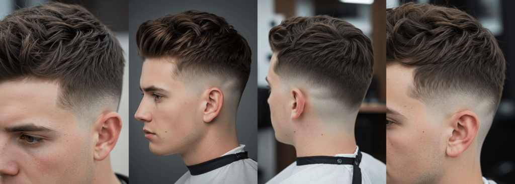 A classic style with a modern twist. The top (3–5 inches) is combed to one side, creating a defined part. The sides fade down with clippers for sharp contrast. It suits most face shapes and works for both professional and casual settings.